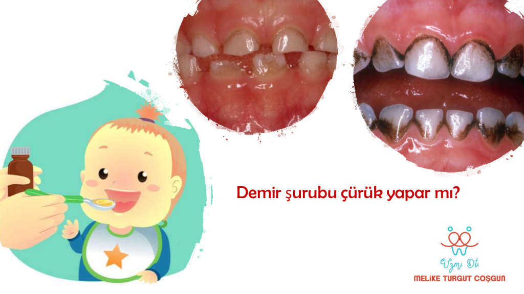 Demir şurubu dişleri çürütür mü❓ 🌟Demir eksikliği çocuklarda sık görülmektedir. Bu nedenle erken yaşlarda demir eksikliği için kullanılan ilaçların en sık yan etkilerinden birisi dişlerde meydana gelen siyah lekelerdir. 💊Çocukların ilaçları daha rahat içebilmesi için tatlarını iyileştirmek adına şurupların içerisine yüksek oranda şeker ilave edilmektedir. Düzenli diş fırçalama yapılmadığında şeker içeriğine bağlı olarak ilaç kullanımı çürük oluşumunu tetikleyebilir. 👩🏻‍⚕️😷Demir eksikliği için kullanılan ilaçların neden olduğu diş lekelerinin tedavisinde çocuk diş hekiminizin dişlerin üzerinde oluşan leke tabakasının temizlemesi yeterlidir.